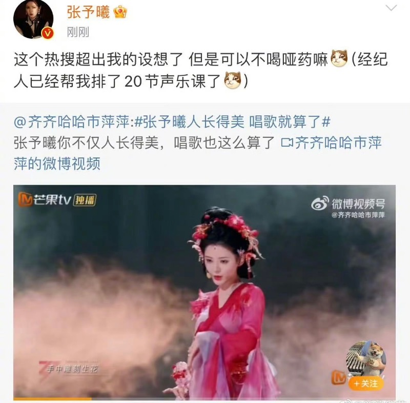 隨著初舞台播出,立刻就有「張予曦人長得美,唱歌就算了」的熱搜,還有質疑芒果後期不是忘記給張予曦修音了?對此,張予曦發文回應稱:「這個熱搜超出我的設想了,但是可以不喝啞藥嘛(經紀人已經幫我排了20堂聲樂課了)」