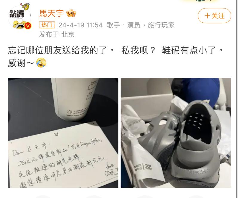 沒想到這位內娛活人,這次也被氣得…直接清空微博了!是噠,到底怎麼一回事呢?原來是馬天宇的一則推廣微博,被審判了!先來看看,馬天宇先是曬了一雙鞋子禮物,表示忘記誰送的了:「私我,鞋碼小了。」