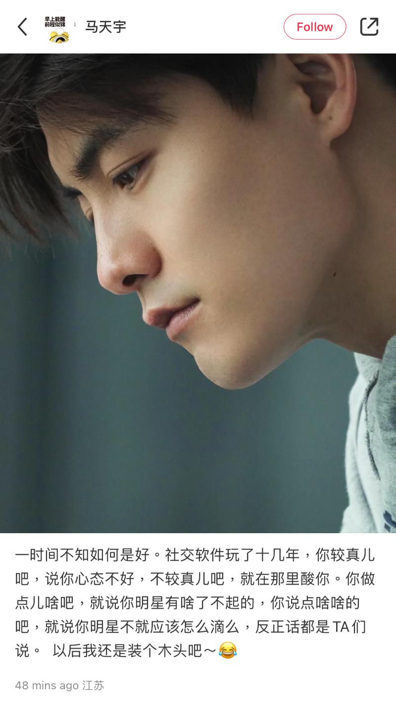 不過,馬天宇特別在另一個社交平台發帖回應,表示不管怎麼做似乎都會引來爭議:「話都是TA們說,以後我還是裝個木頭吧~」感覺真的對微博…失望了啊!