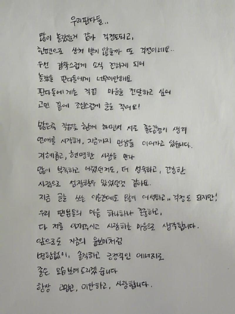 兩人的親信表示:「Rado是尹普美最堅實的幫手。尹普美是給Rado 力量的存在,據我所知,兩人已經約定好了末來。」隨著新聞曝光,普美也上傳了親筆信認了戀情!全信如下: