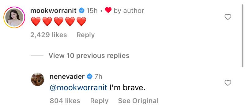 Nene甚至還回復Mook的留言,自稱:「我很勇敢。」