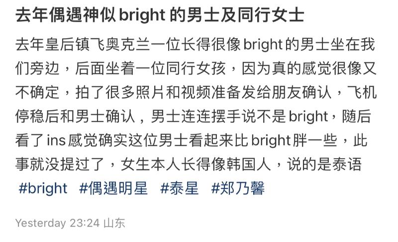 就是說,隨著兩人承認戀情,越來越多網友公開了之前偶遇兩人的證據,當中包括了原來早在去年,就有網友在飛去紐西蘭的班機上偶遇兩人!根據原Po,當時就發現身邊的男生長得很像Bright,不過對方一直否認👇