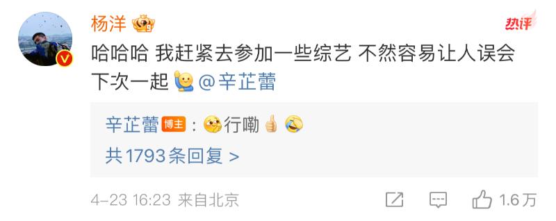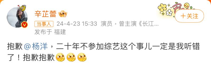 沒想到這句話在節目播出之後,上了熱搜第一,嚇得辛芷蕾立刻發文道歉,表示:「抱歉楊洋 ,二十年不參加綜藝這個事一定是我聽錯了!抱歉抱歉!」