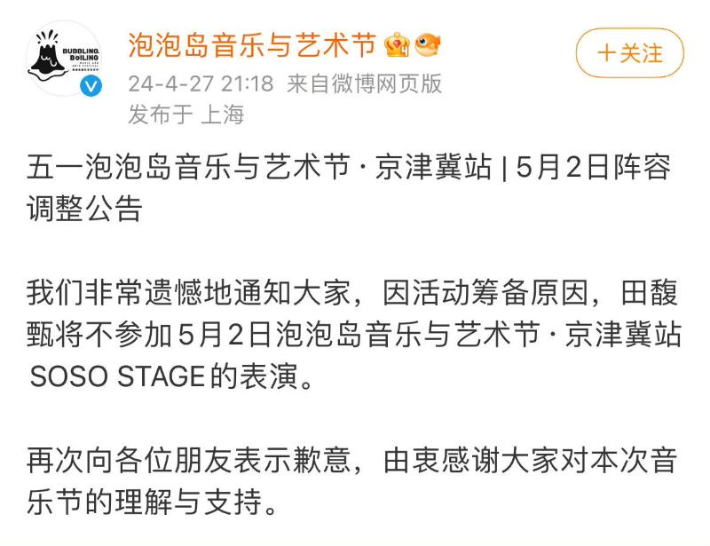 雖然但是,在27號晚上,也就是音樂節即將舉辦的前五天,主辦單位官宣「因活動籌備原因」,田馥甄將不參加5月2日音樂節👇