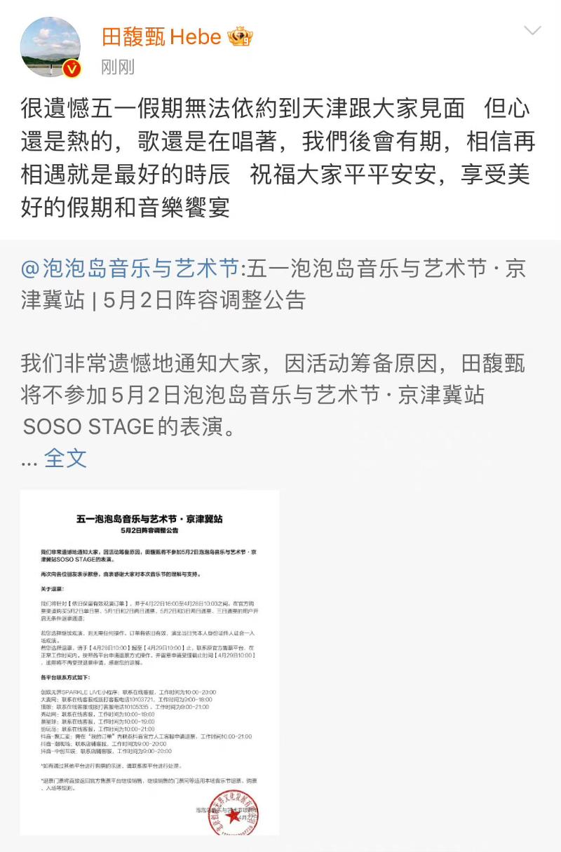 而田馥甄也轉發微博表示:「很遺憾五一假期無法依約到天津跟大家見面,但心還是是熱的,歌還是在唱著,我們後會有期,相信再相遇就是最好的時辰。祝福大家平平安安,享受美好的假期和音樂飨宴。」