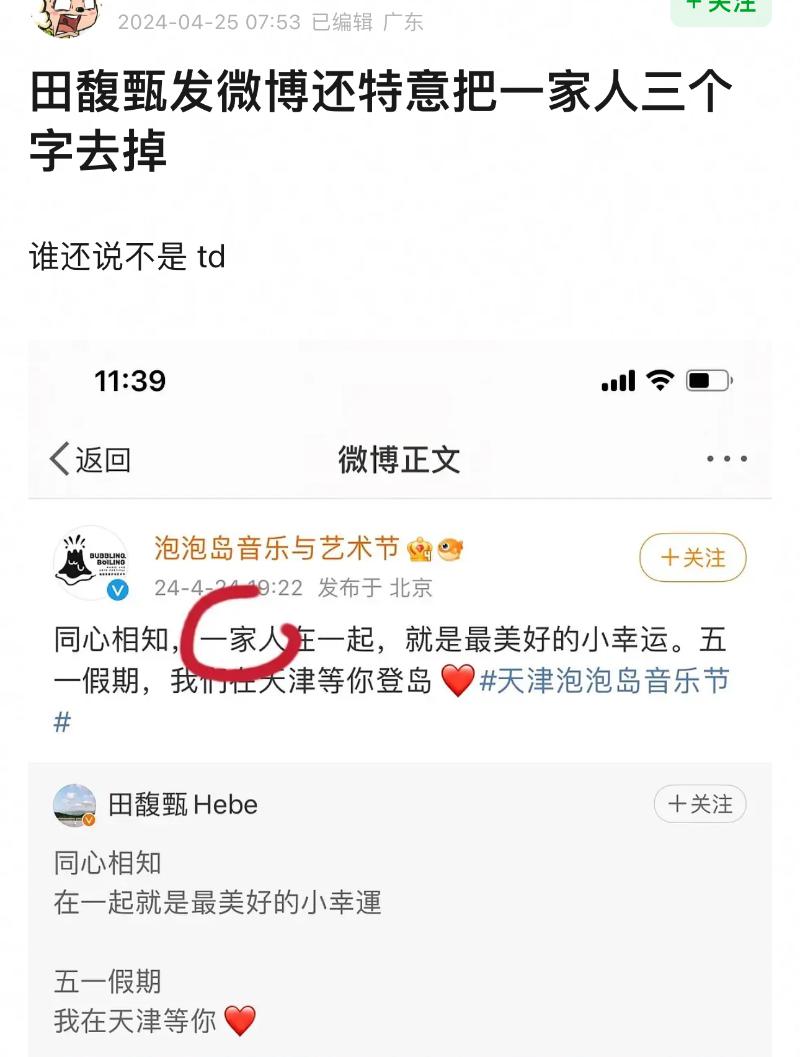 到底怎麼一回事呢?原來網友發現,在音樂節轉發的文案中,出現了田馥甄帖文中沒有的「一家人」,網友推斷一般文案都是主辦單位準備好,因此怒斥田馥甄居然還去掉了「一家人」👇