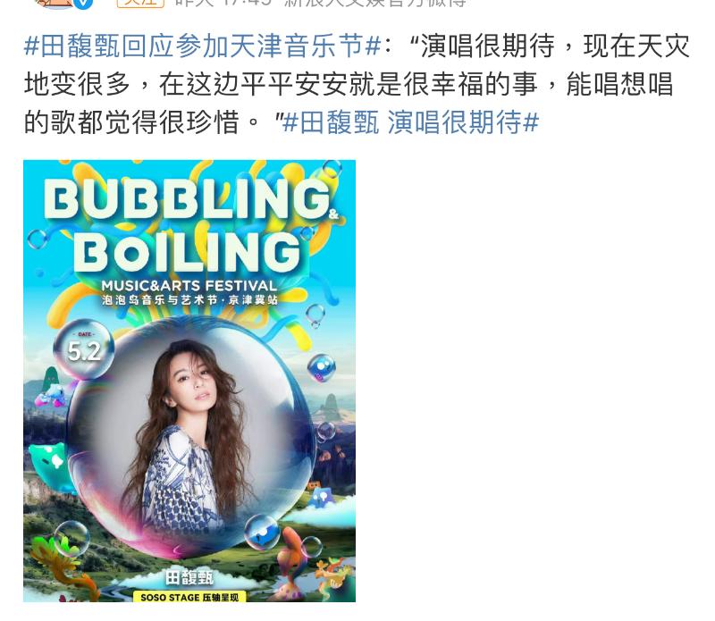 近日,田馥甄突然在無預警下,官宣將出席5月2日在天津舉辦的音樂節,引起了極大關注!在田馥甄發文官宣之後,音樂節也火速轉發,但沒想到卻引來第一波爭議!
