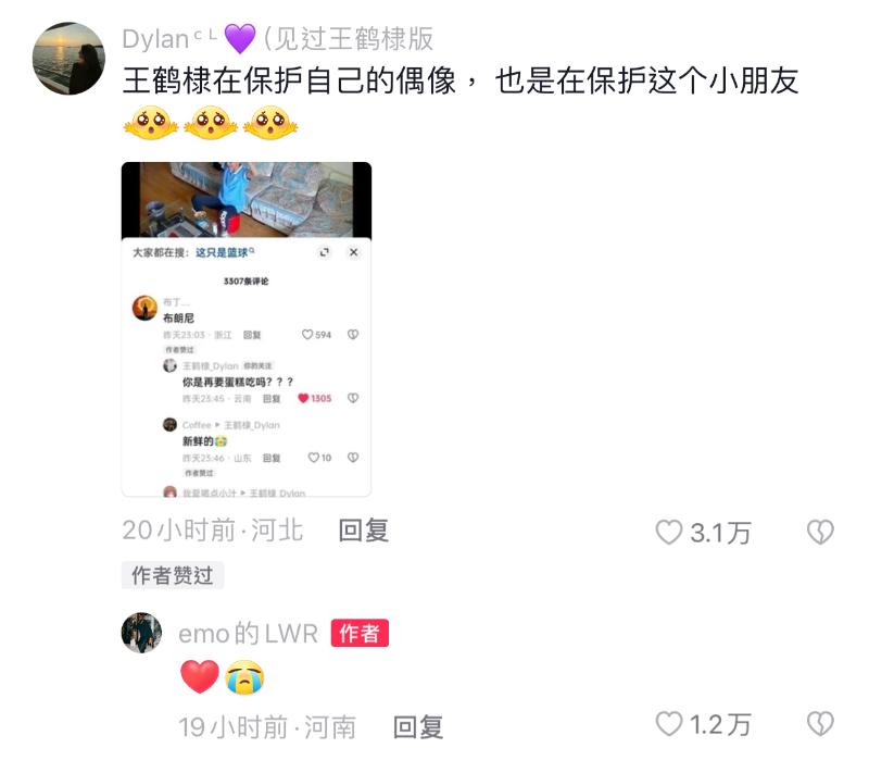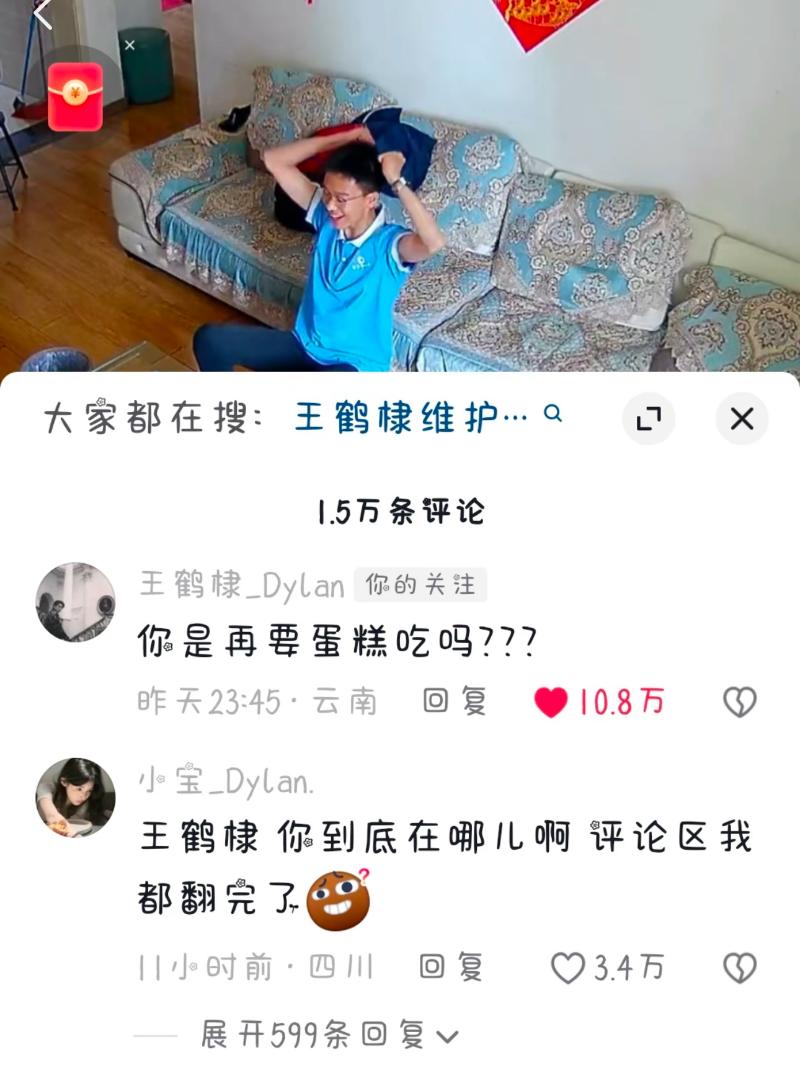 結果沒想到居然引來了也是同擔的王鶴棣下場,在留言嘲諷小男孩是“布朗尼”的黑粉評論下反擊:「你是再(在)要蛋糕吃嗎?」