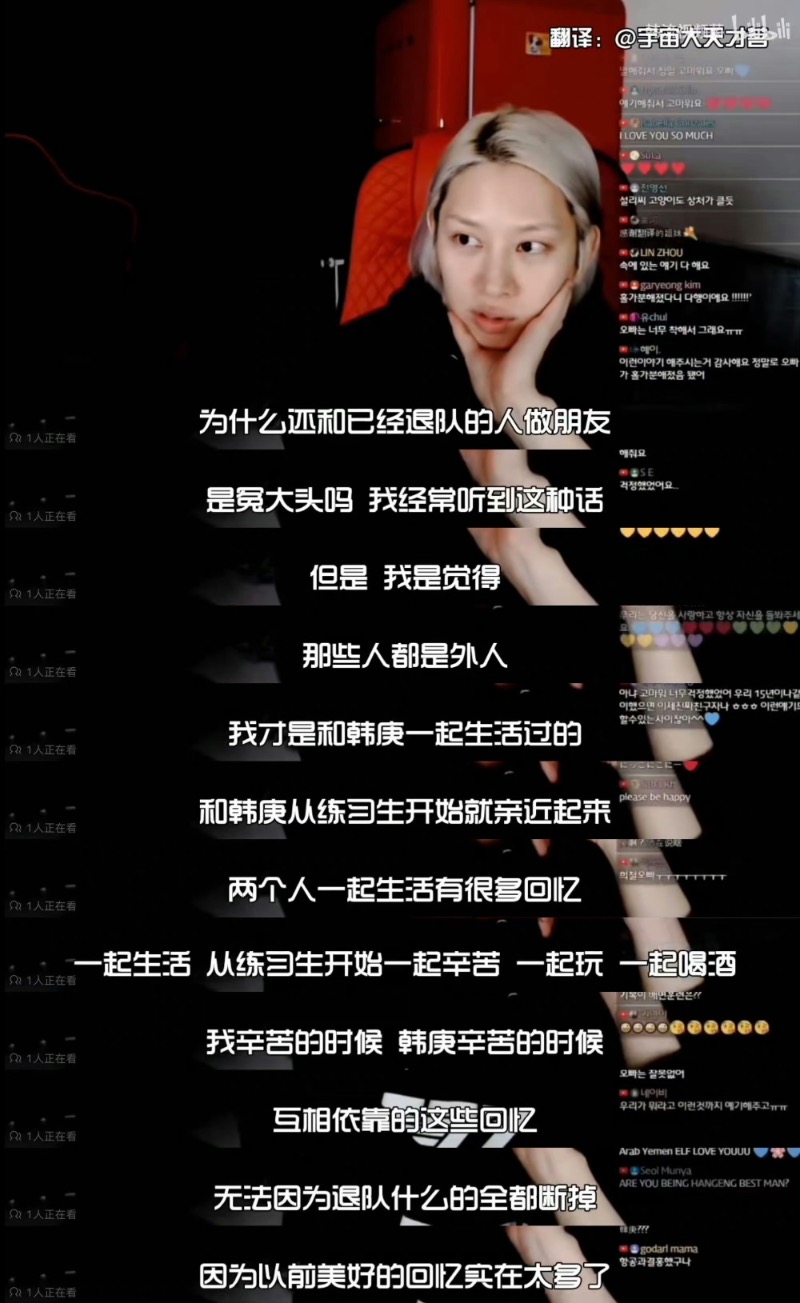 對於為什麼還和韓庚聯繫,希澈霸氣表示:「那些人都是外人,我才是和韓庚一起生活過的,和韓庚從練習生開始就親近起來,兩個人一起生活有很多回憶,從練習生開始一起辛苦一起玩一起喝酒,我辛苦的時候,韓庚辛苦的時候,互相依靠的這些回憶,無法因為退隊甚麼的全都斷掉」