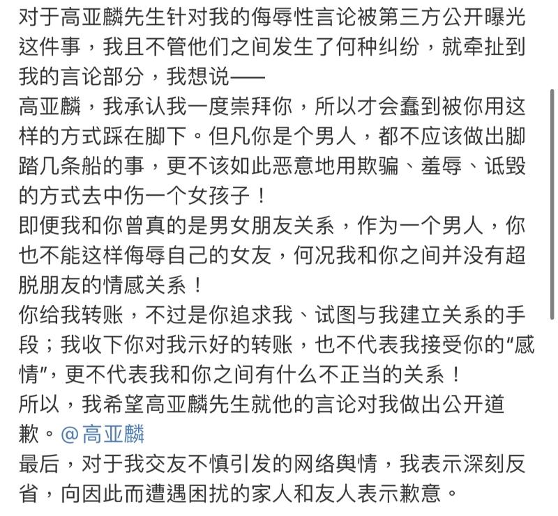 言歸正傳,這次爭議中,除了爆料的魏嘉之外,高亞麟和徐梓鈞都沒有回應,沒想到徐梓鈞沉默了2天,居然在10號傍晚發長文,但內容是要求高亞麟向自己道歉?