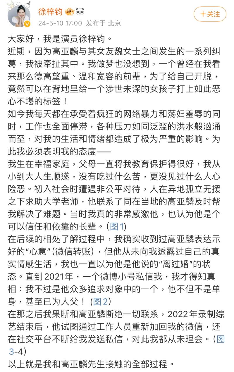 言歸正傳,這次爭議中,除了爆料的魏嘉之外,高亞麟和徐梓鈞都沒有回應,沒想到徐梓鈞沉默了2天,居然在10號傍晚發長文,但內容是要求高亞麟向自己道歉?