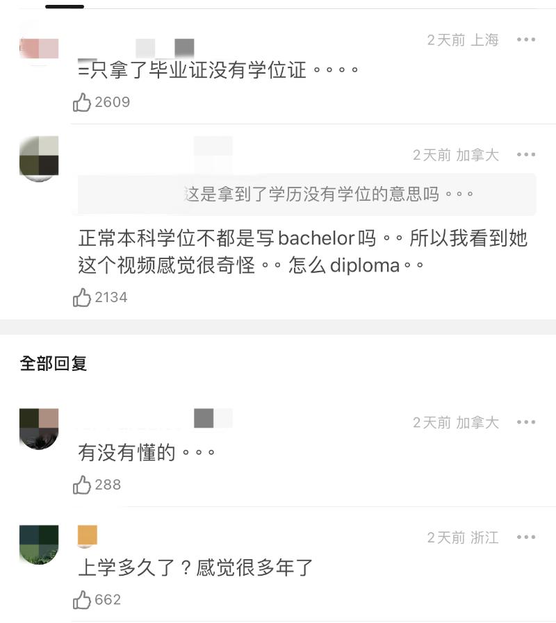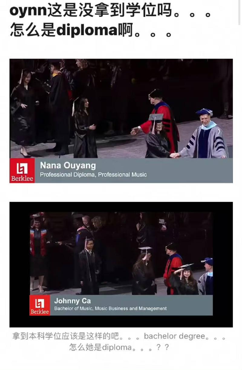 但更驚人的來了!有網友發現歐陽娜娜領取文憑時,顯示的和其他大學生不一樣,先來看看,歐陽娜娜的是「Diploma」,其他人寫的則是「Bachelor Degree」於是,網友紛紛在線質疑,這是讀了6年就念了個大專文憑,沒拿到大學學位的意思嗎?