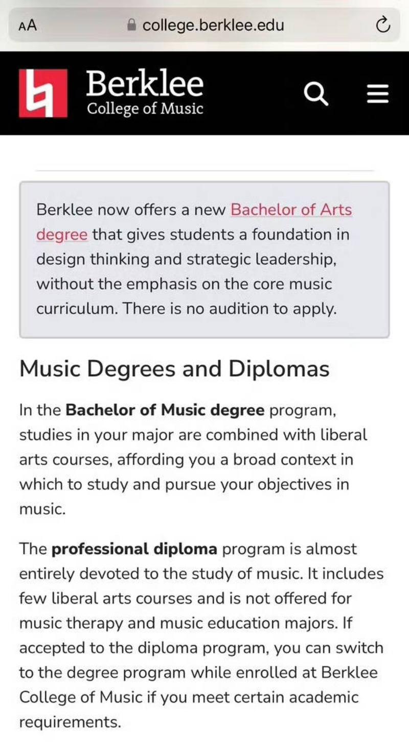 還有扒來了伯克利音樂學院的Diploma和Degree的分別👇