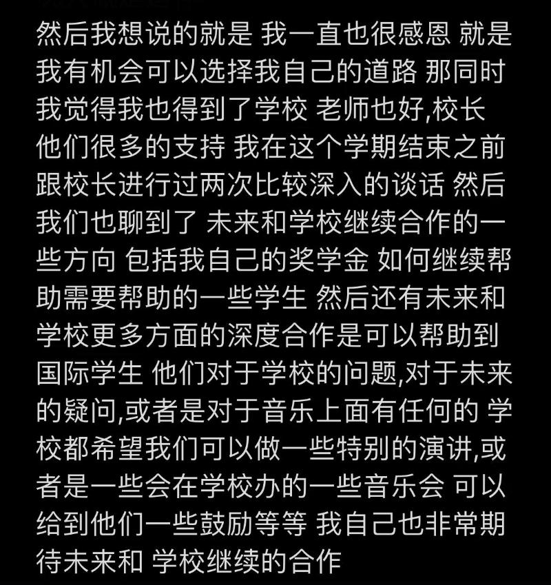 4.對于未來的規劃和在學校學習的期間,感謝老師和校長的支持,畢業前夕和校長深度溝通了兩次,關于“歐陽娜娜獎學金”(指歐陽娜娜開音樂會,收益全部用于“伯克利獎學金”)以及對國際學生的支持,校長希望常回來演講或演出;
