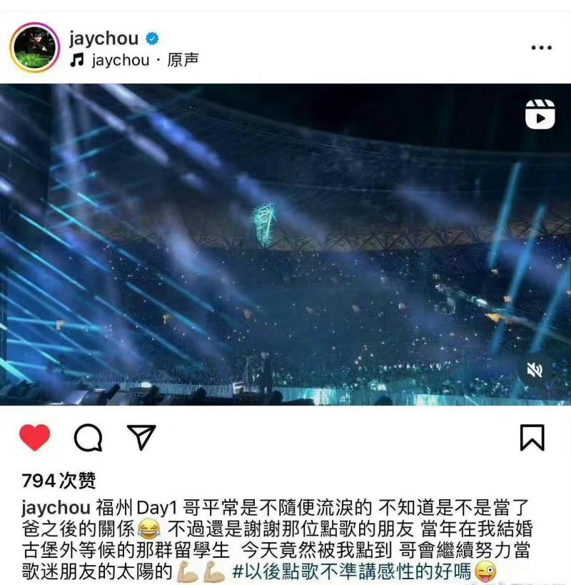 隨後周董發文回應,表示自己平時是不隨便落淚的:「哥平常是不隨便流淚的,不知道是不是當了爸之後的關係,不過還是謝謝那位點歌的朋友。當年在我結婚古堡外等候的那群留學生,今天竟然被我點到,哥會繼續努力當歌迷朋友的太陽的!」