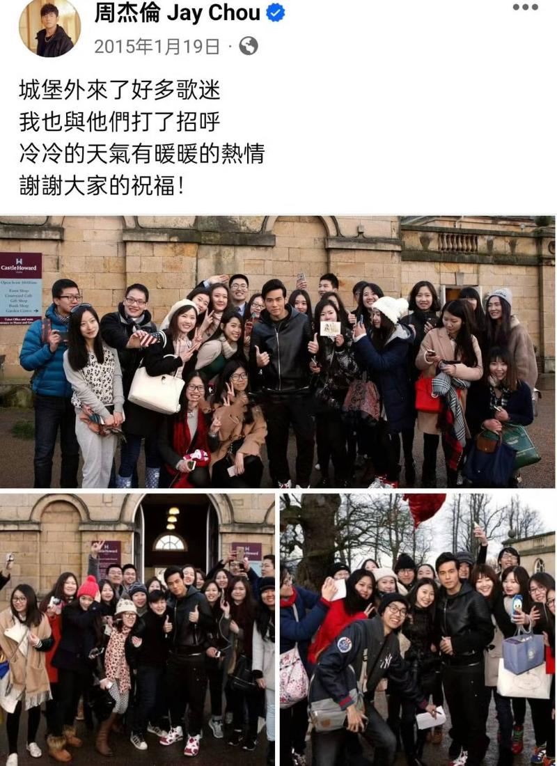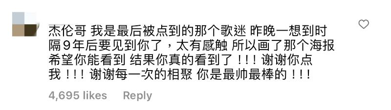 粉絲告白文字版看起→ 歌迷:「這是我第三次見你」「第一次見面,是在西門町你《十二新作》專輯發售,那時候很巧也是在這個角度裡對著我,宿命~」「第二次見你,是在英國約克霍華德城堡,你還記得那群留學生嗎?你出來和大家合影,而我就是其中一個!」「杰倫,我是直男,但是我發自內心的,我真的覺得杰倫哥你太帥了!