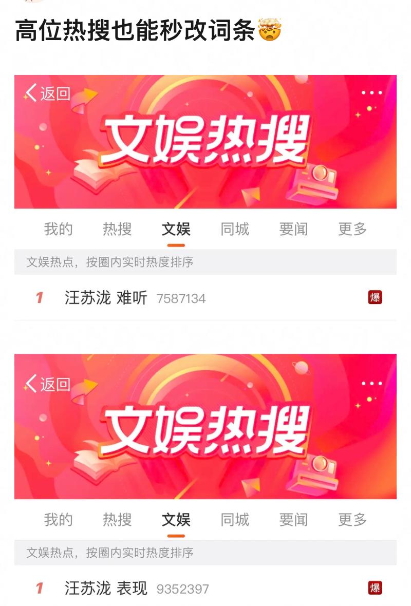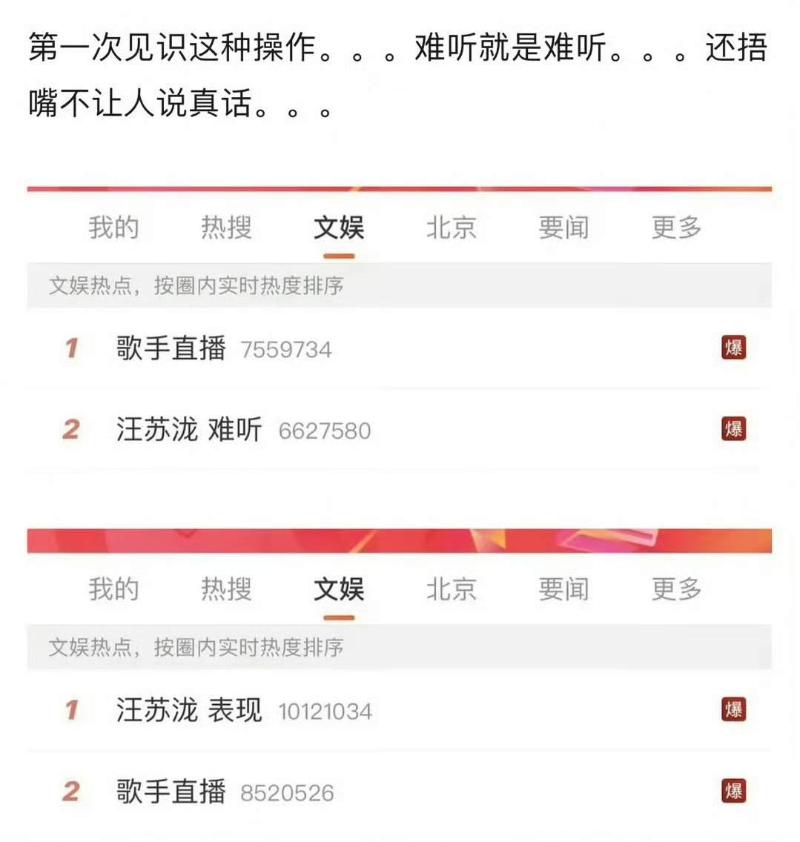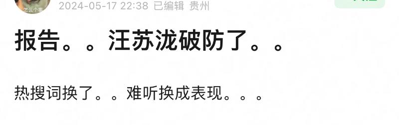 但讓人覺得驚訝的是,這個「汪蘇瀧難聽」的高位熱搜詞,居然在節目結束之後,火速被換成了「汪蘇瀧 表現」,讓不少網友發帖吐槽,表示汪蘇瀧輸不起👇