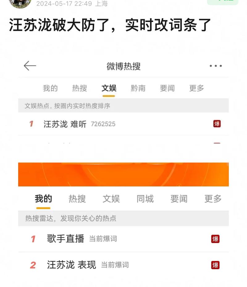 雖然但是,在訪問歌手們的時候,沈夢辰有意將手機遠離汪蘇瀧,但汪蘇瀧卻努力往手機靠,卻不料和自己有關的熱搜居然是「汪蘇瀧 難聽」,後面還帶了一個紅色的爆👇