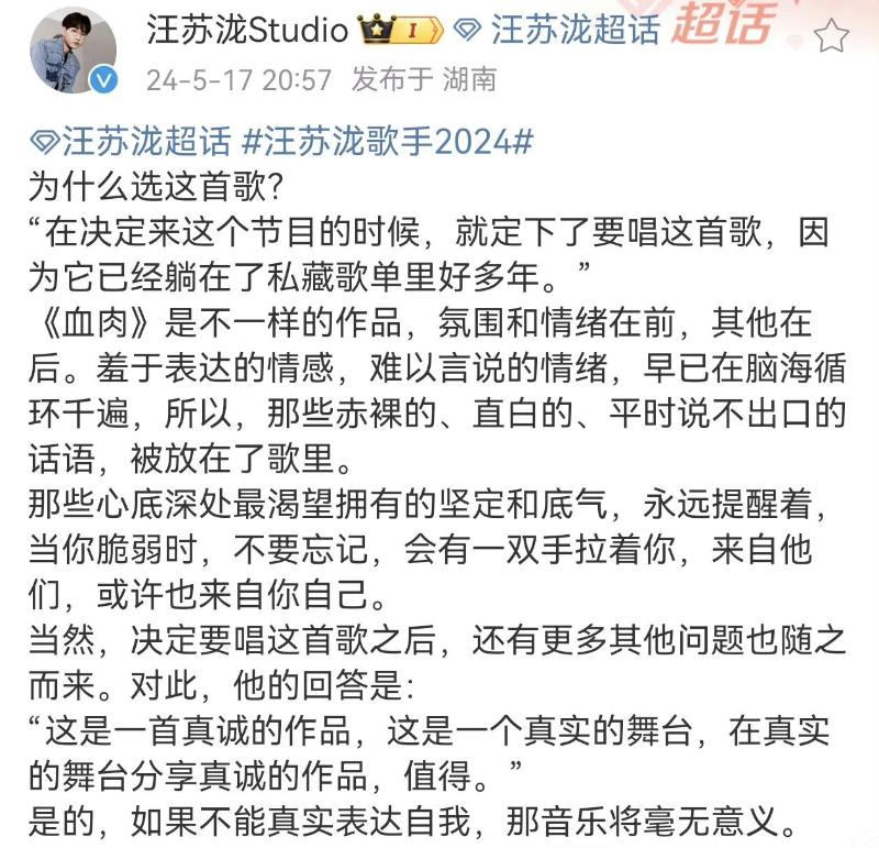 就是說,汪蘇瀧工作室在節目播出時,曾發文解釋了為什麼選唱這首歌👇