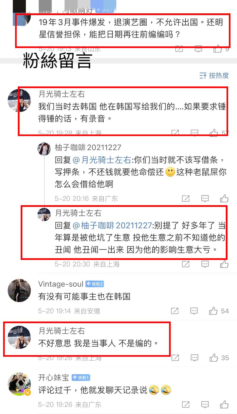 最好笑的是,有粉絲留言表示2019年3月,李勝利已經被限制出國,怎麼可能來中國借錢?結果被原Po回復,表示當時是他們去韓國,如果需要的話,可以公開錄音👇