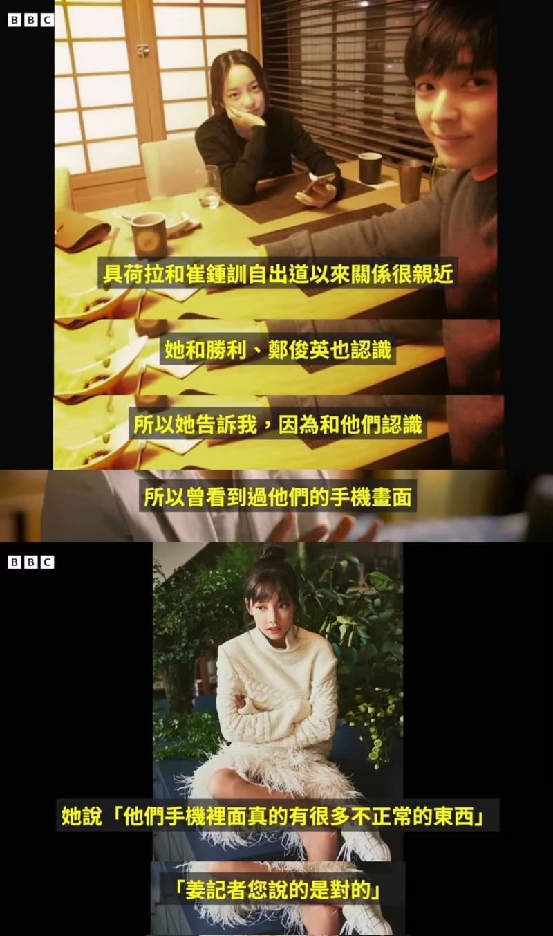 媽啊!這誰能接受的了啊!是噠,BBC公開了紀錄片《Burning Sun:揭露韓流明星的聊天房秘密》,詳細記錄了李勝利、鄭俊英、崔鍾訓下藥性侵女性事件的紀錄,當中報道了具荷拉曾幫助記者尋找線索!