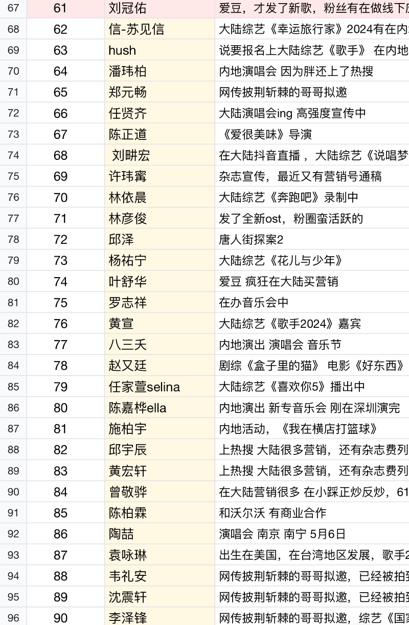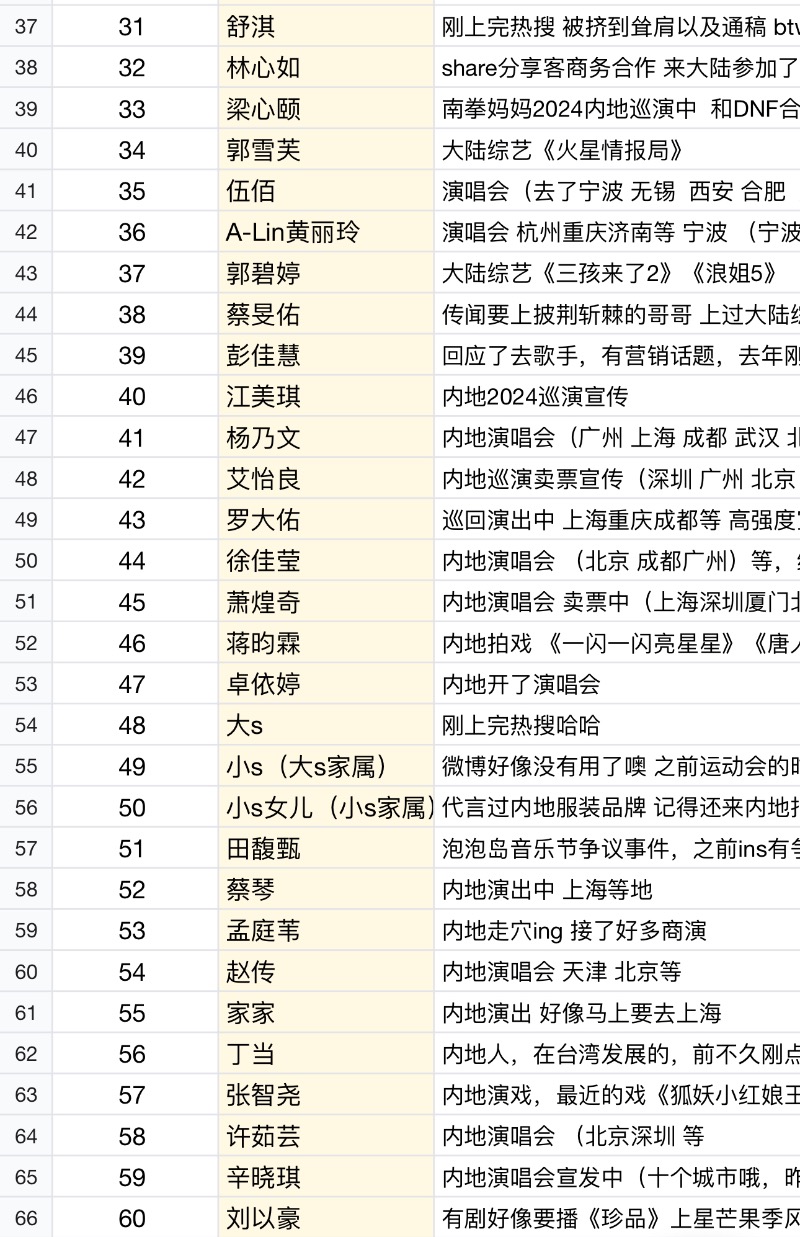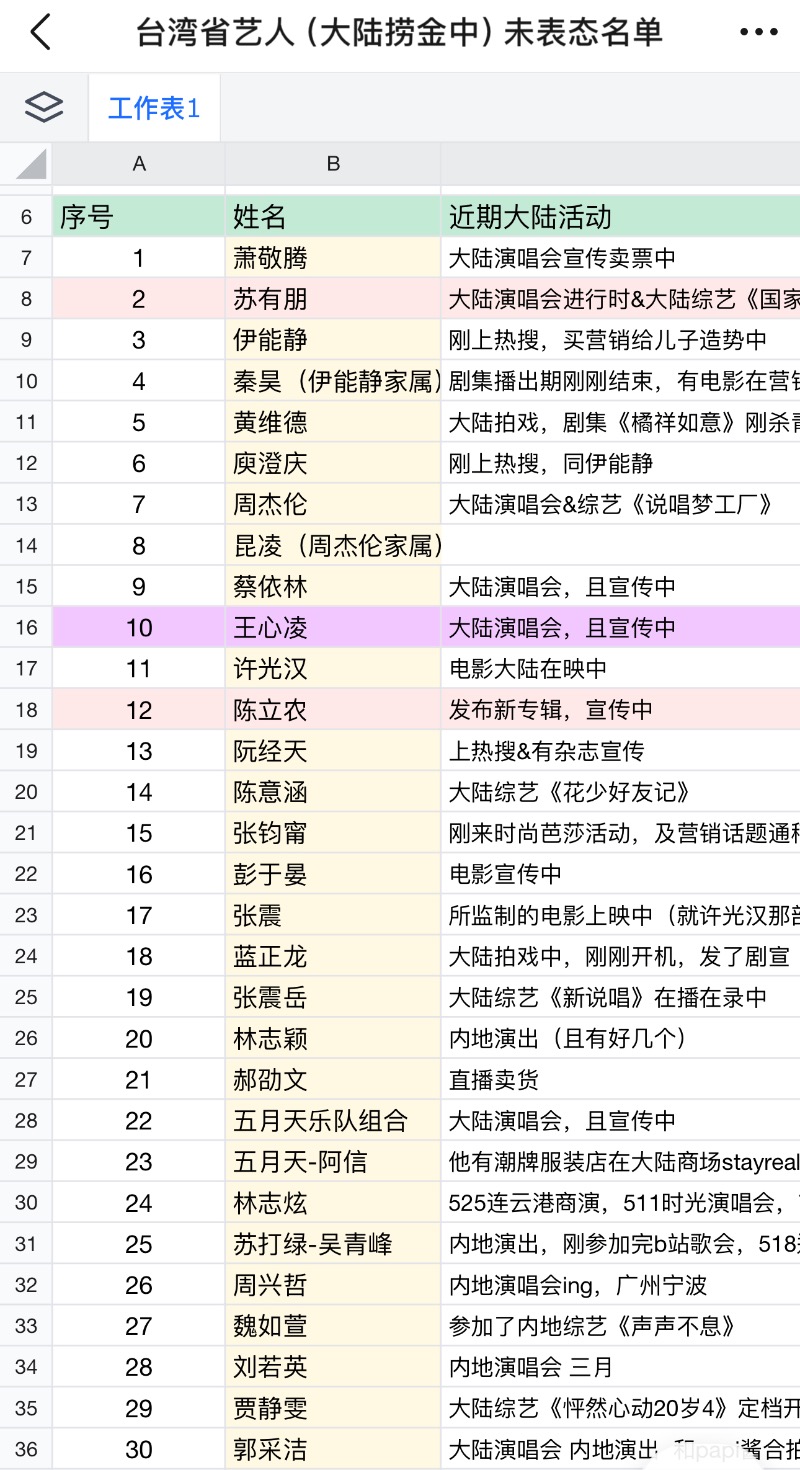 最後,來看看網友最新整理(截至24號下午5點)的台灣藝人名單,黃色部分為未轉發藝人👇