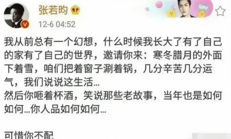 而對於父親,張若昀曾發文:「我以前總有一個幻想,什麼時候我長大了,有了自己的家,有了自己的世界,邀請你來。寒冬臘月的外面下著雪,咱們把著窗子涮著鍋,幾分辛苦幾分運氣,我們說說這生活,然後你笑說那些老故事。可惜你不配。」但隨即秒刪!