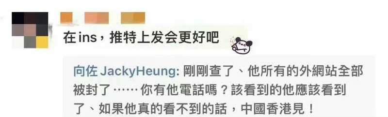沒想到這件事居然還有後續,起因是有網友留言給向佐,表示應該在INS留言他才看得到,沒想到得到向佐回覆,表示:「剛剛查了、他所有的外網站全部被封了⋯你有他電話嗎?該看到的他應該看到了、如果他真的看不到的話,中國香港見!」
