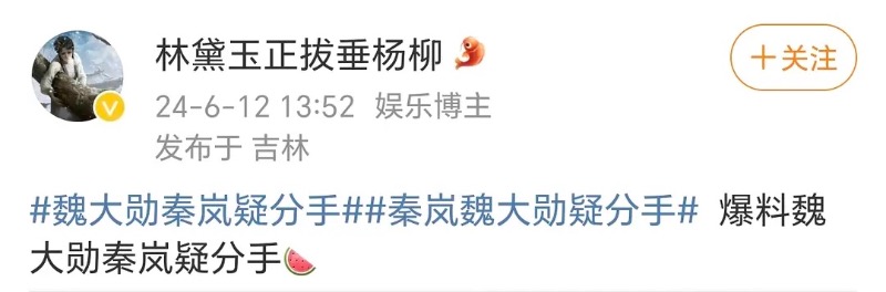 沒想到在12號這天,有狗仔和營銷號連接發文,表示秦嵐、魏大勛已經分手!