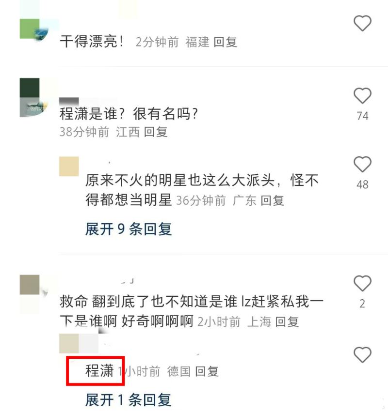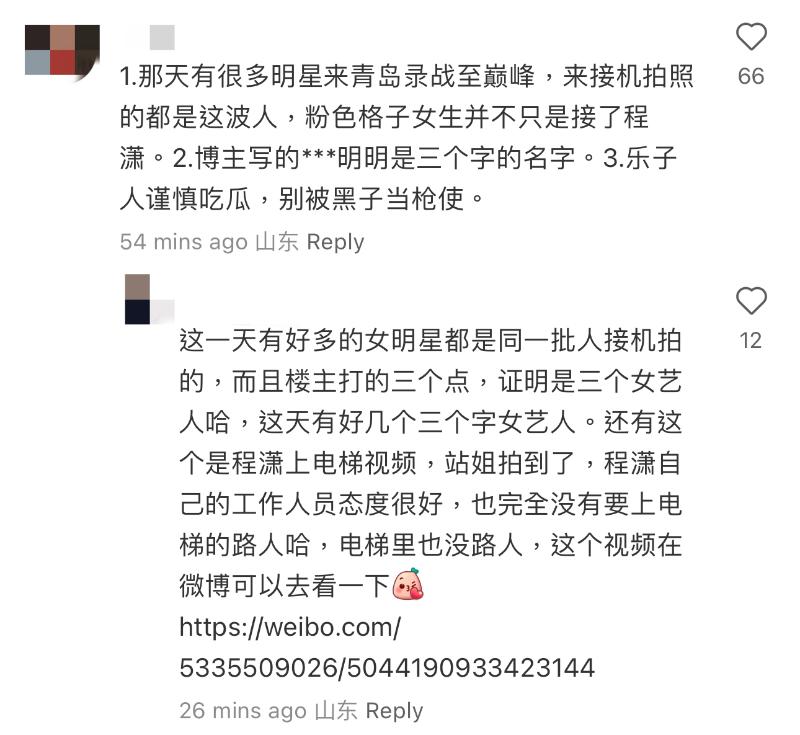 原Po公開貼文之後,自然不少網友都在線好奇,到底當事女藝人是誰?結果評論區突然cue起了前往青島錄製綜藝的程瀟👇