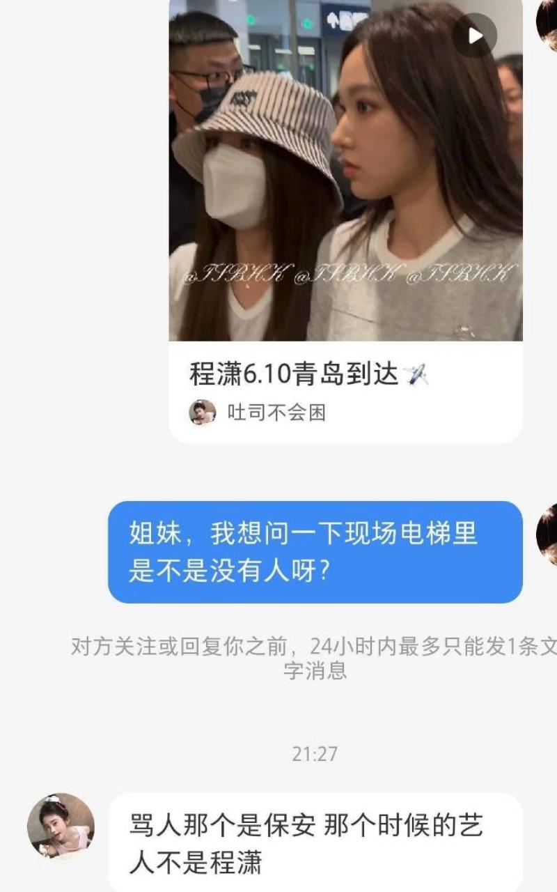 還公開了拍攝視頻的網友的聊天截圖,確認在電梯內罵人的保安,其護送的藝人不是程瀟👇