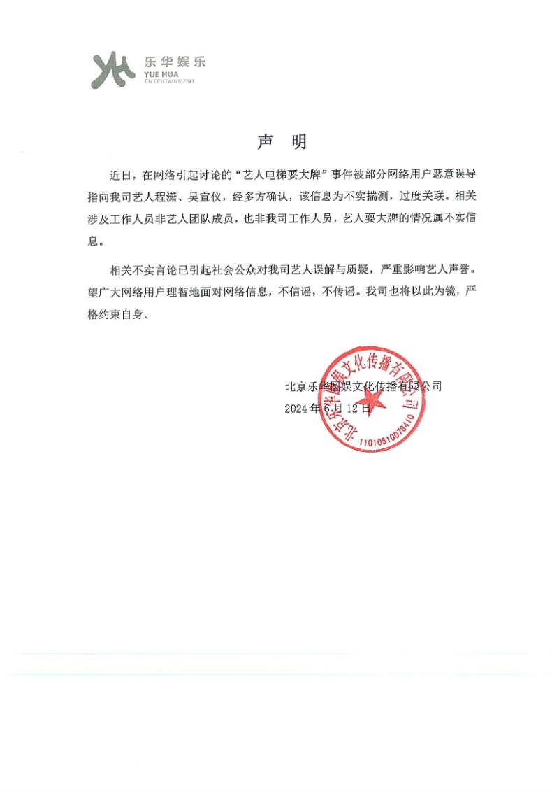 樂華發聲明,否認旗下藝人程瀟、吳宣儀耍大牌👇