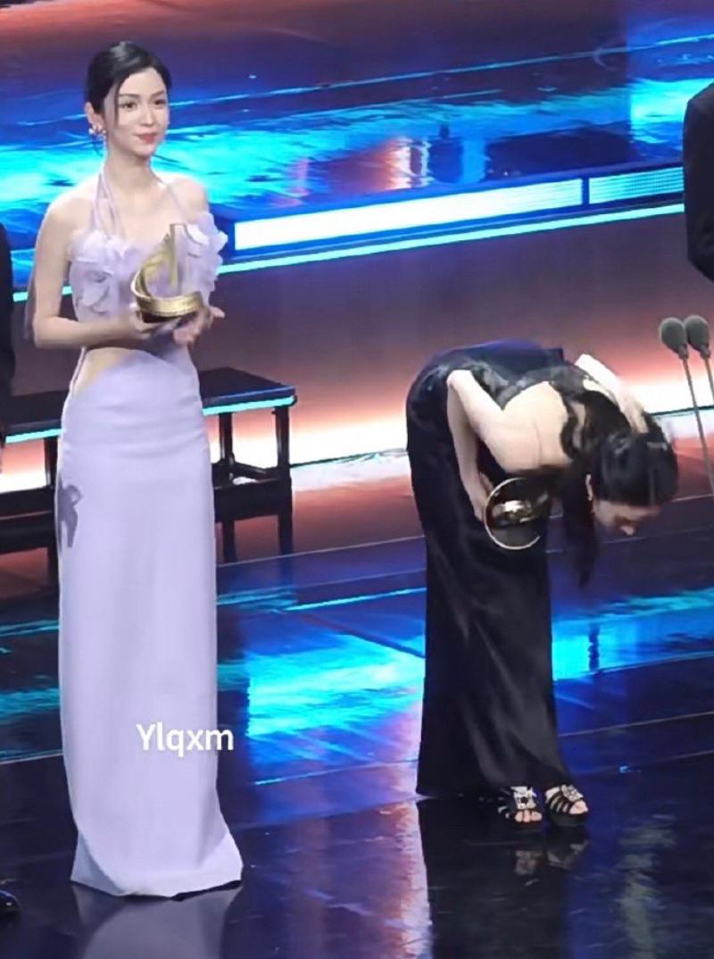 最後,在頒獎典禮上,周也和同樣拿獎的劉浩存,不同的姿勢又被審判了👇