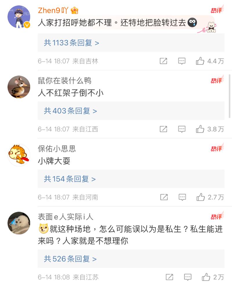 視頻公開之後,評論區都在吐槽周也態度有問題,媒體舉著台標挂著工作證,主動打招呼,屬於正常上班,但她不但不回應,還故意別開了鏡頭,來看熱評👇