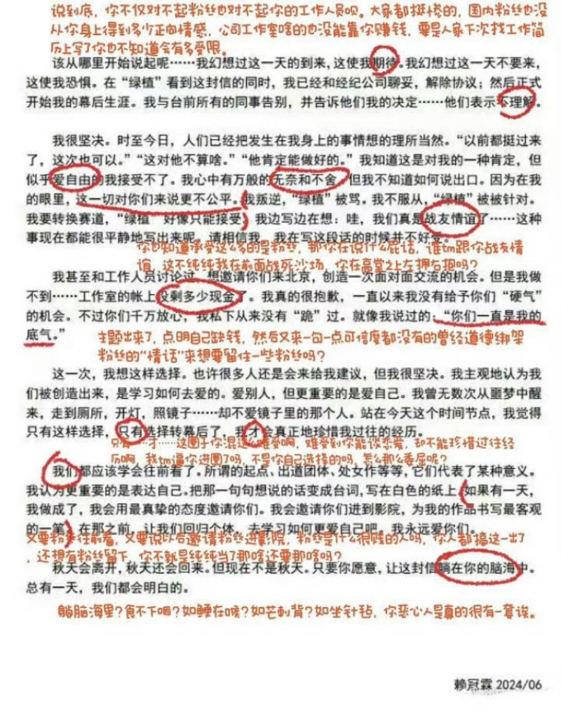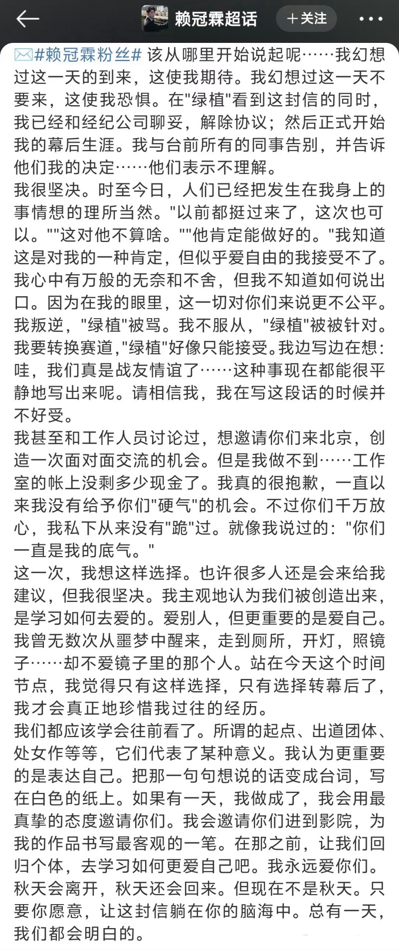 而其粉絲對接,也在15號公開了賴冠霖寫給粉絲的信,當中提到了自己已經和經紀公司解約,正式開始自己的幕後生涯,儘管工作人員表示不理解,但他還是想這麼做。