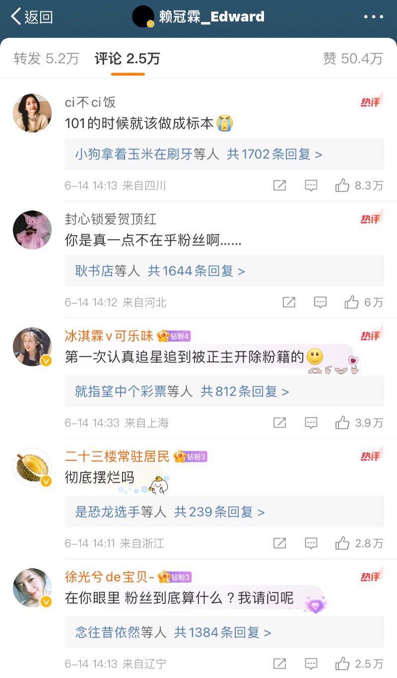 而賴冠霖宣布退圈之後,評論區粉絲一面倒在吐槽👇