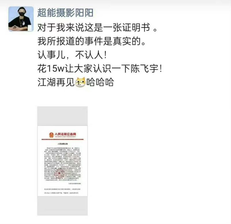 對此,沒想到該狗仔還在朋友圈回應:「我所報道的事件是真實的,花15萬讓大家認識一下陳飛宇」