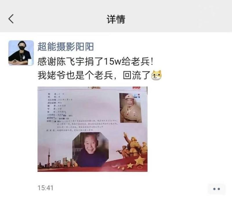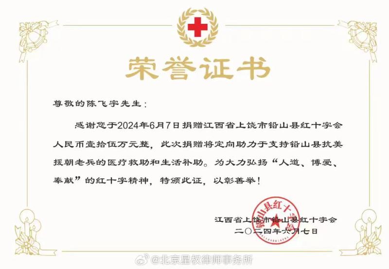 而陳飛宇也將賠償的15萬,全部捐贈給紅十字會,定向用于志願軍老兵幫扶👇