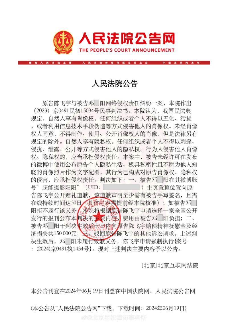 沒想到這件事還有後續,20號這天,陳飛宇代表律師發聲明,表示告「超能攝影陽陽」侵權案簡訊結果,該狗仔被要求公開賠禮道歉,並賠償精神撫慰金及經濟損失共計150000元。