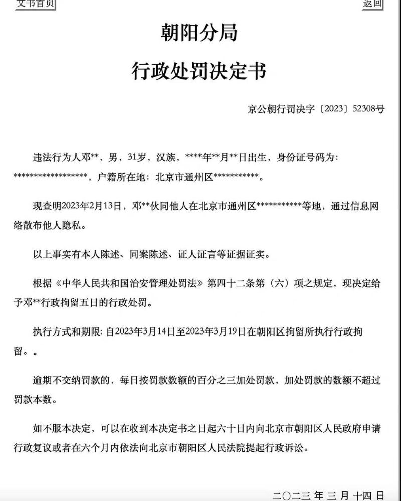 神通廣大的網友,繼續扒出進一步資料,發現處罰原因是「侵犯隱私」,而舉報人是「陳某某」,處罰結果是「行政拘留」,只差沒報陳飛宇身份證了👇