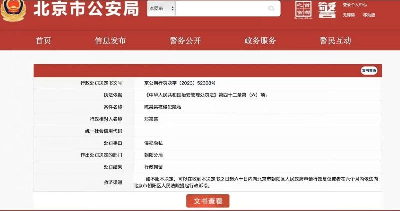 沒想到這件事居然還有後續~是噠,早在床照曝光不久,曝光了這件事的狗仔就被捉進警局,網友扒出了公安局的行政處罰決定書,上面寫明犯罪原因是「通過信息網絡散佈他人隱私」👇
