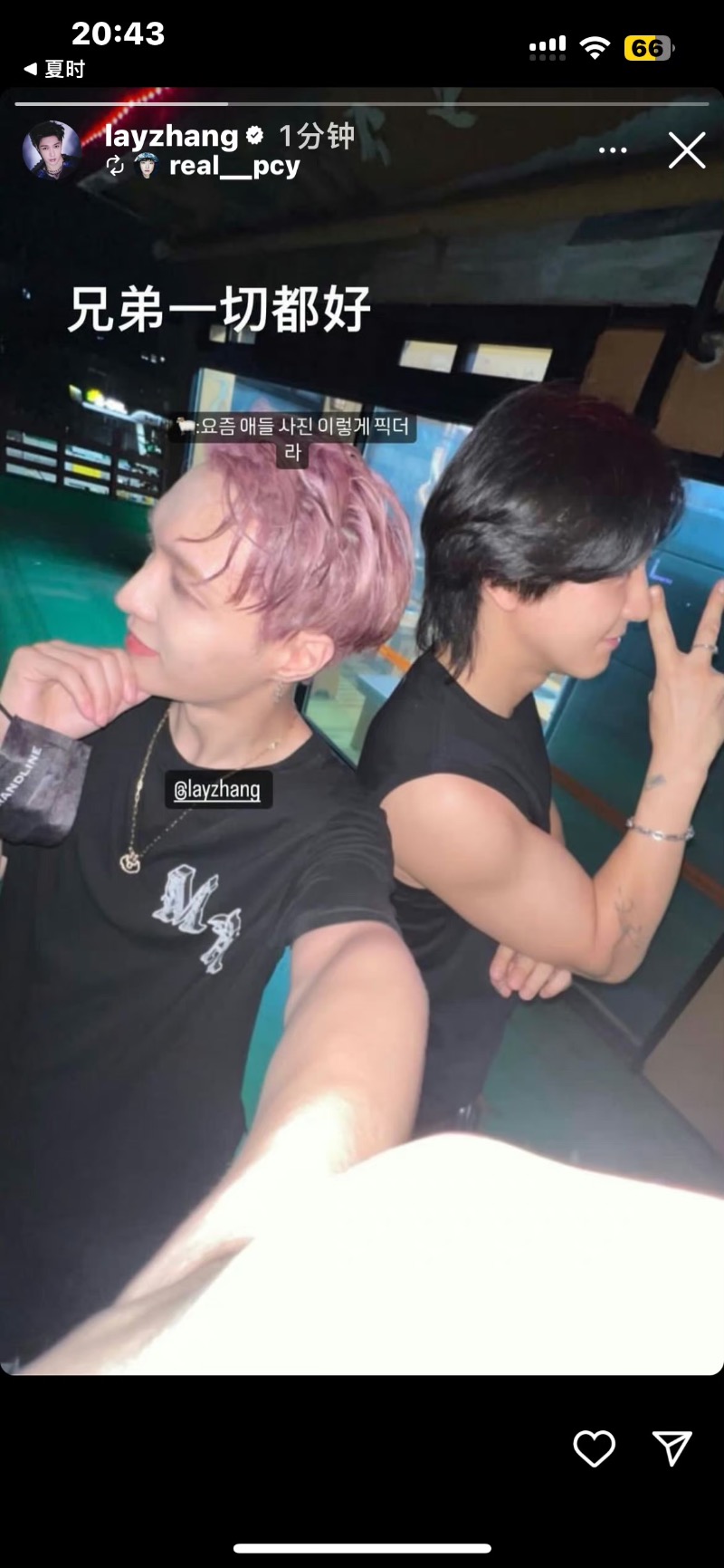張藝興隨後也轉發了同樣的合照,並配上了:「兄弟一切都好!」
