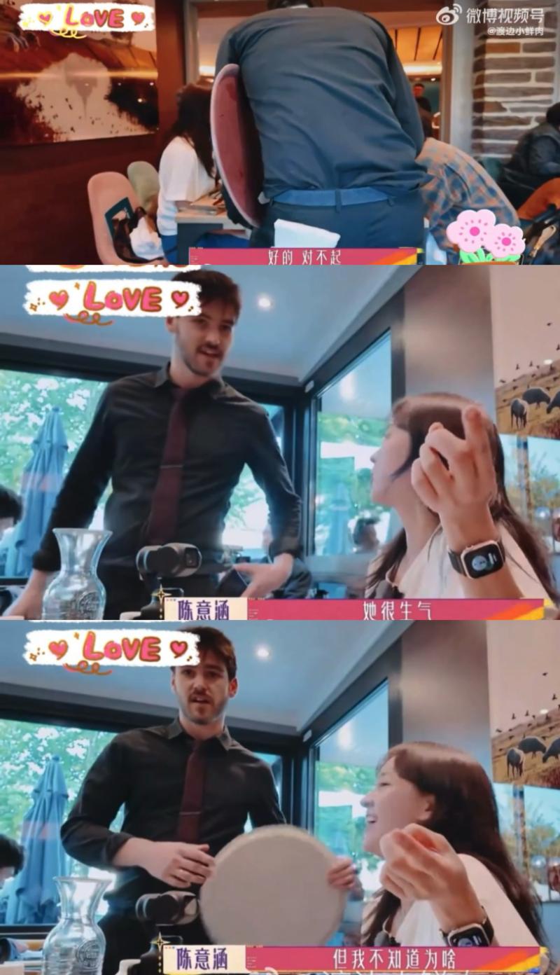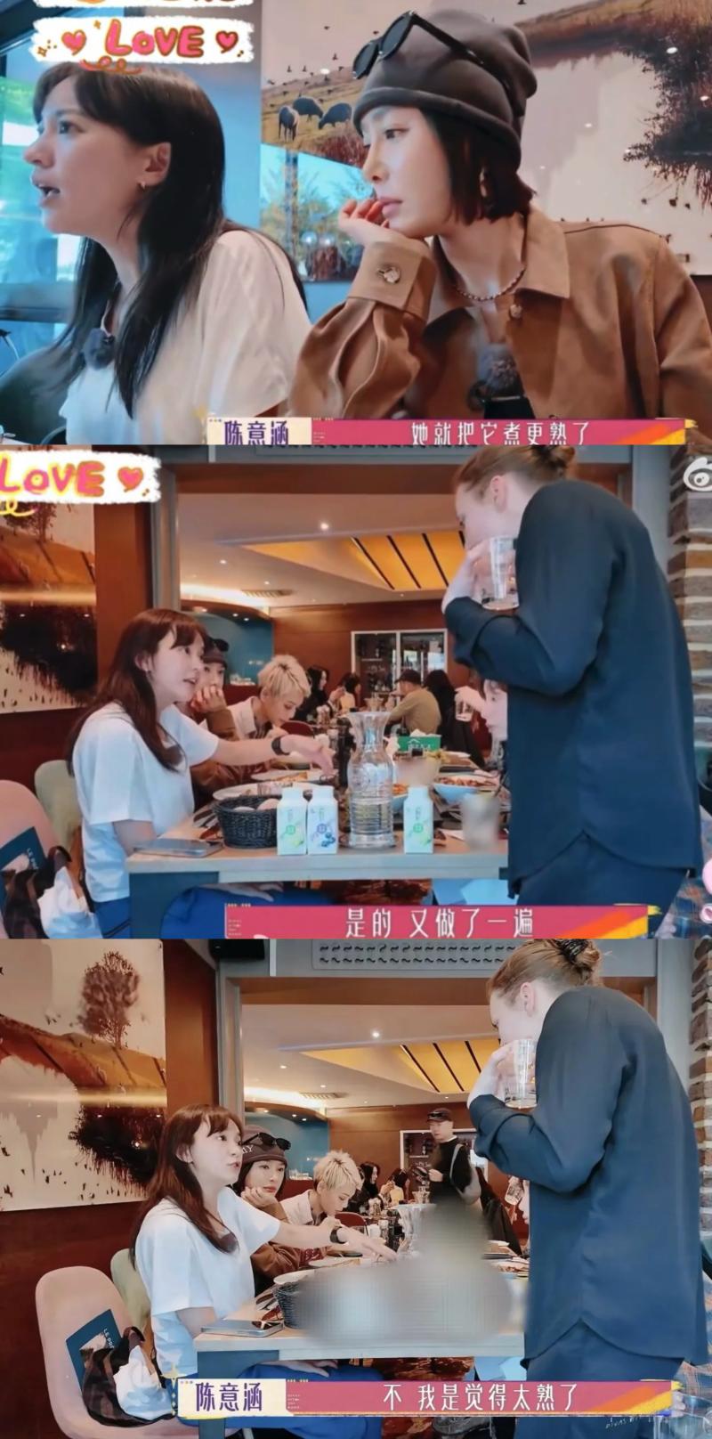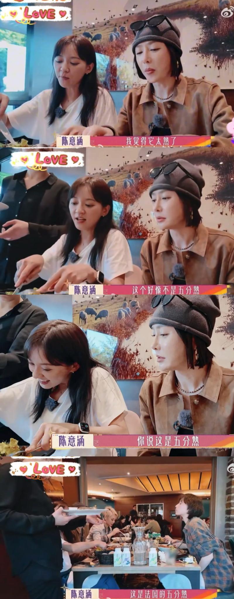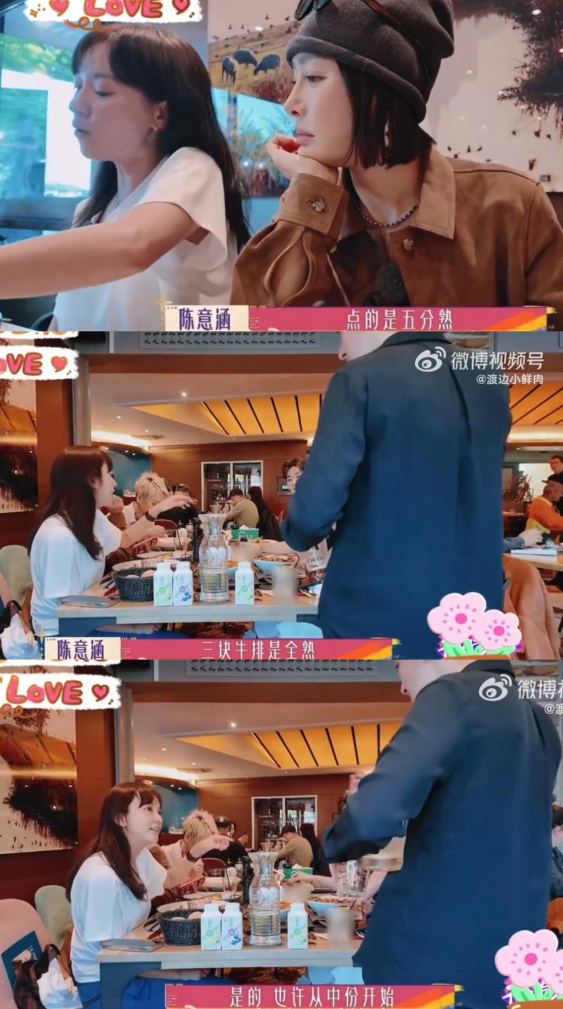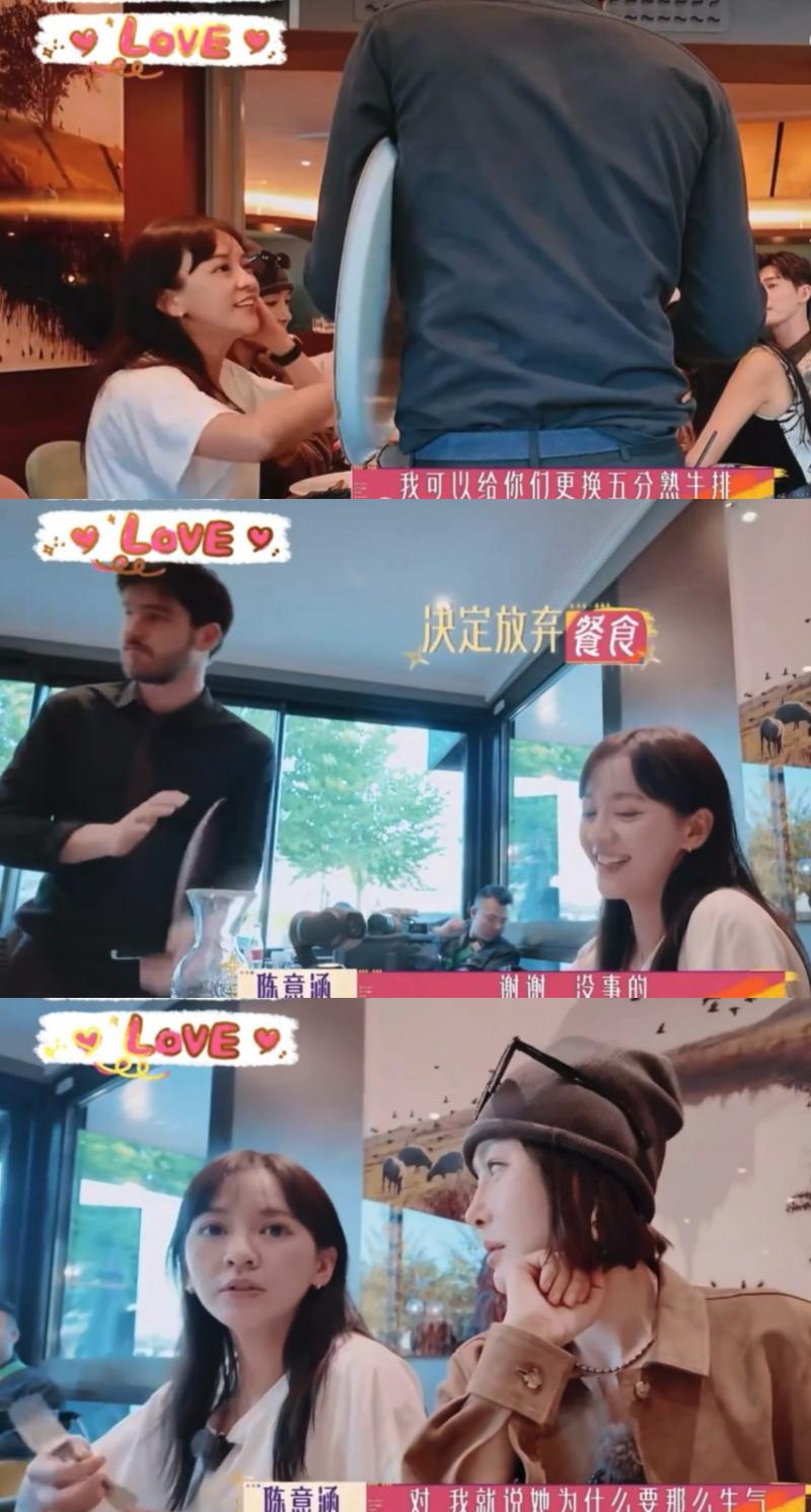 陳意涵吃驚地切著牛排給服務生看,經過協調之後,服務生表示重做,但明明是3份,她卻只取走了一份。陳意涵還不明白,為什麼不把另外兩份牛排也端走,張翰解釋說服務生只說了重新做一份。