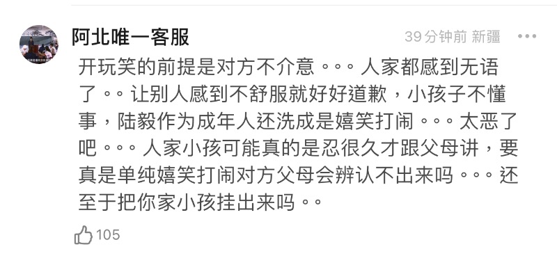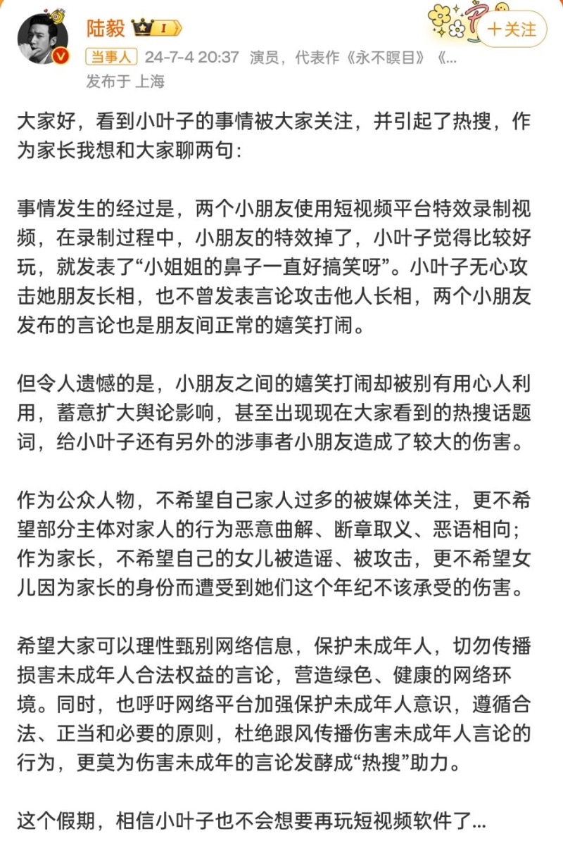 隨後陸毅發了長文,解釋了事情的經過後,表示女兒小葉子在和朋友拍攝短視頻時,因為對方特效掉了,所以小葉子才會說出對方鼻子搞笑的言論。沒想到本來屬于朋友之間的玩笑,卻被有心人利用了。對此,陸毅直呼作為家長不希望看到女兒被攻擊。另外他還呼籲保護未成年人,杜絕跟風傷害!