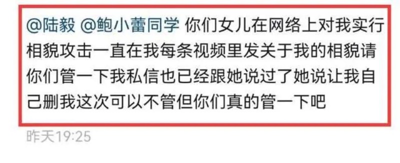 沒想到小女兒小葉子居然被同學指控霸凌?有網友發文艾特陸毅和鮑蕾,表示小葉子在網絡上對自己進行相貌攻擊,一直在自己的每條視頻下發關于相貌的留言,原Po聲稱自己私信了小葉子,但對方讓她自己刪,更聲稱這次就罷了,希望陸毅跟鮑蕾好好管管,而這個自稱是小葉子同學的人,還曬出了多張證據。