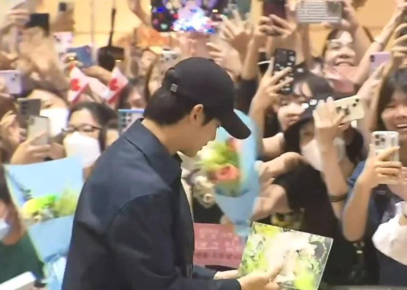 粉絲們有序接機,而金秀賢也福利大派送,突然衝向粉絲群收下粉絲遞來的信件和禮物,並為其中一個粉絲簽名!