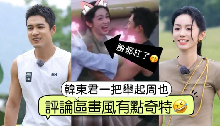一旁的韓東君見狀,就讓周也面向自己,下一秒一把將周也舉起,「擺」在了石頭上🤣