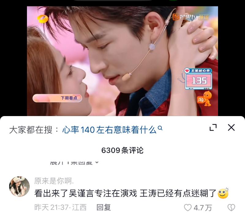 最後喝醉的吳謹言倒在王星越懷中,我們肅國公的心跳正式飆升至142!!!不過事實上,根據在場粉絲的repo,實際上王星越心跳飆升到150,只不過節目播出時,切在了142這裡👇