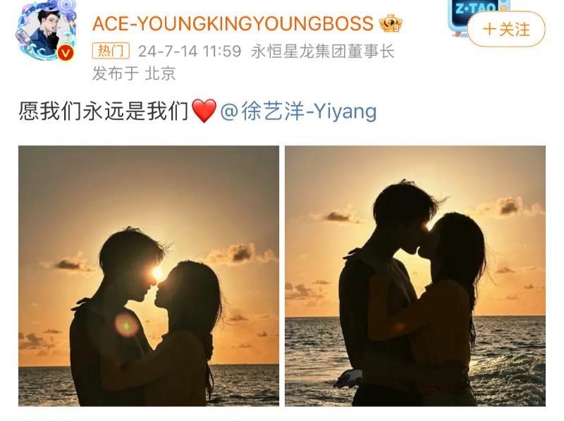 黃子韜的官宣文,則曬出了兩人在夕陽下的親吻照,表示「願我們永遠是我們」,並艾特了徐藝洋!