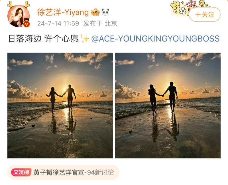而在14號這天的中午11.59分,黃子韜和徐藝洋同步發文,官宣了彼此戀情!先來看徐藝洋的官宣文,曬出了兩人在海邊的牽手照,表示:「日落海邊,許個心願」艾特了黃子韜!